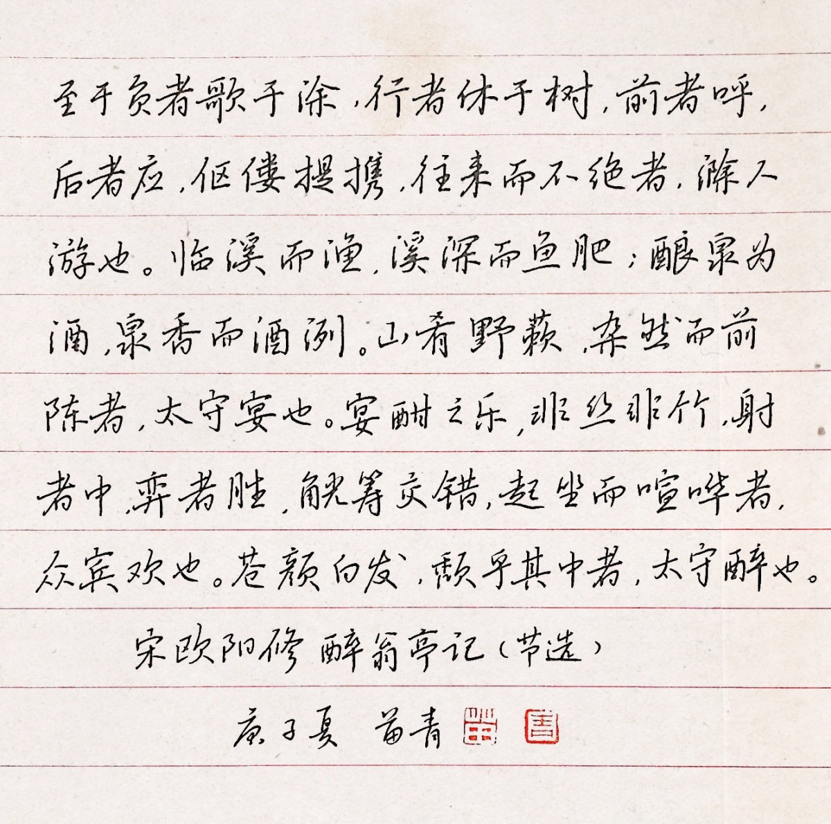 上一期钢笔字打卡作业题目是欧阳修的《醉翁亭记》选段,要求是 简繁不论,但是必须横写 醉翁亭记/欧阳修 至于负者歌于途,行者休于树,前者呼,后者应,伛偻提携,往来而不绝者,滁人游也。临溪而渔,溪深而鱼肥。酿泉为酒,泉香而酒…